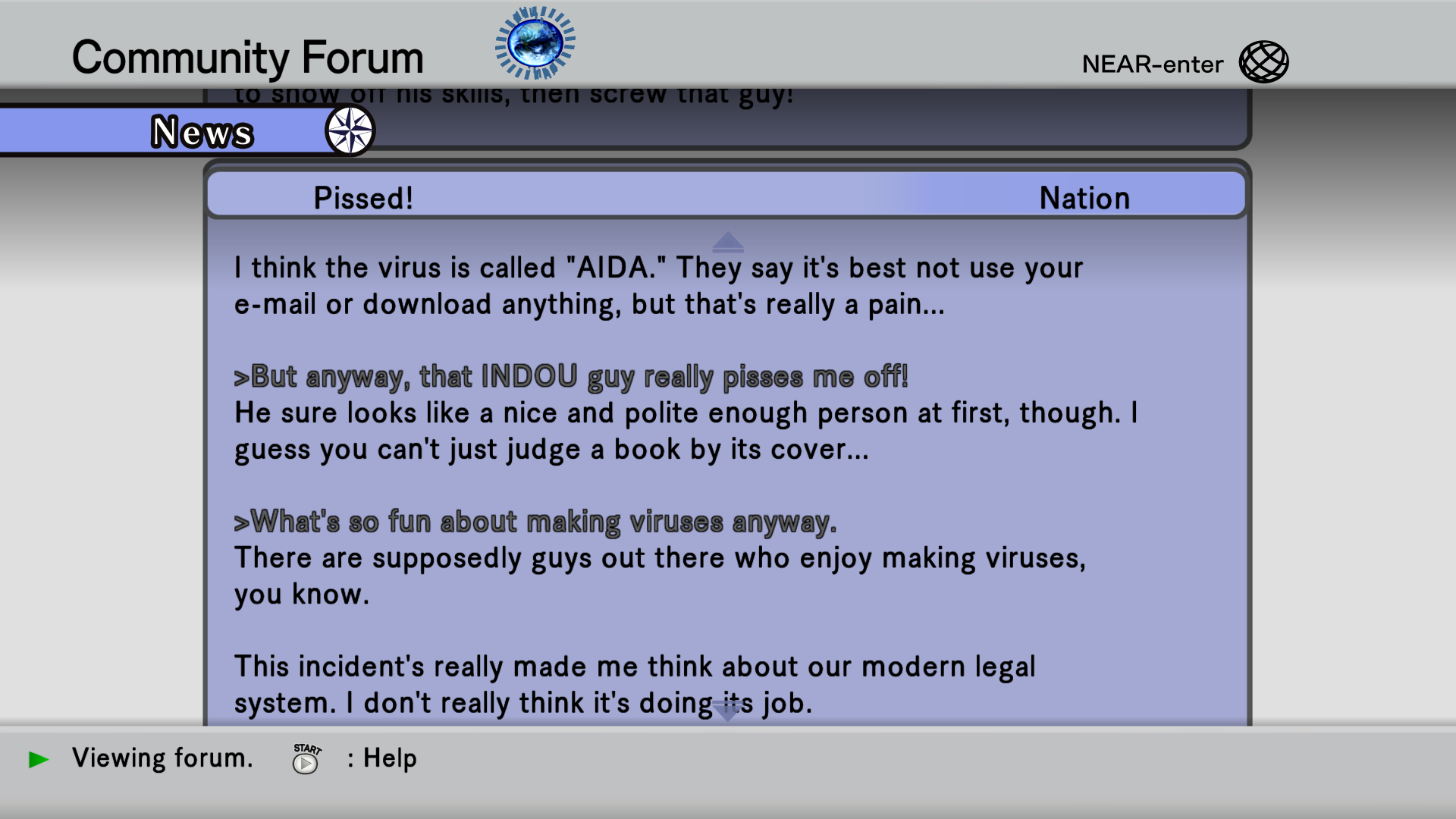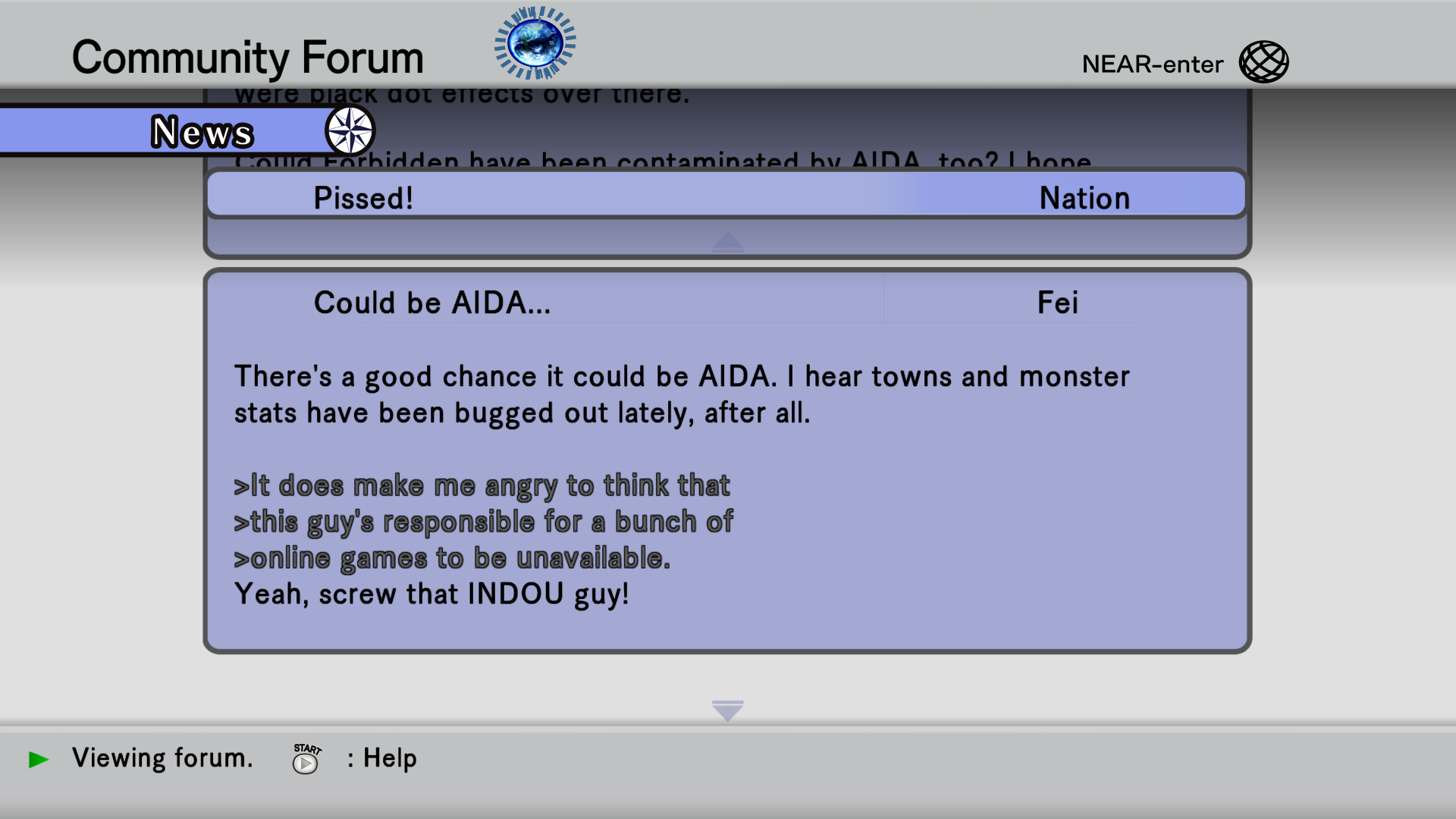 The AIDA are "natural" AIs, formed from the errors in the Internet caused by the disappearance of Aura. Unlike Aura, who was created by a system, the AIDA evolved much like normal life. The AIDA were originally harmless, but after several thousand of them were produced, a mutant appeared. This AIDA, Tri-Edge, had aggressive tendencies, and attacked a player. Since the AIDA are all connected, this aggression soon spread to the rest of them.